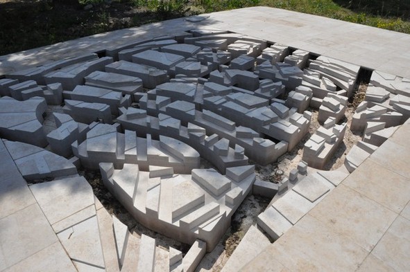 The process of Essen, Istambul and Pécs coming to occupy the same map inspired us to create the map system of a fictive city. After taking the structure of these three cities and superimposing individual details on each other, the thus formed layers produced a plastic art-like spacial fabric. The complexly segmented system clearly resembles its map predecessor; it is the envisioned structure of a town that never was. In each case, we selected the centres which defined the cities, and which through history have been established as their intellectual and cultural fulcrums. The sculpture was placed in front of the former Episcopal Place of Pécs. The horizontal system of the map surrounded by planar surfaces effect a strong contrast with the Renessance-age ruins.